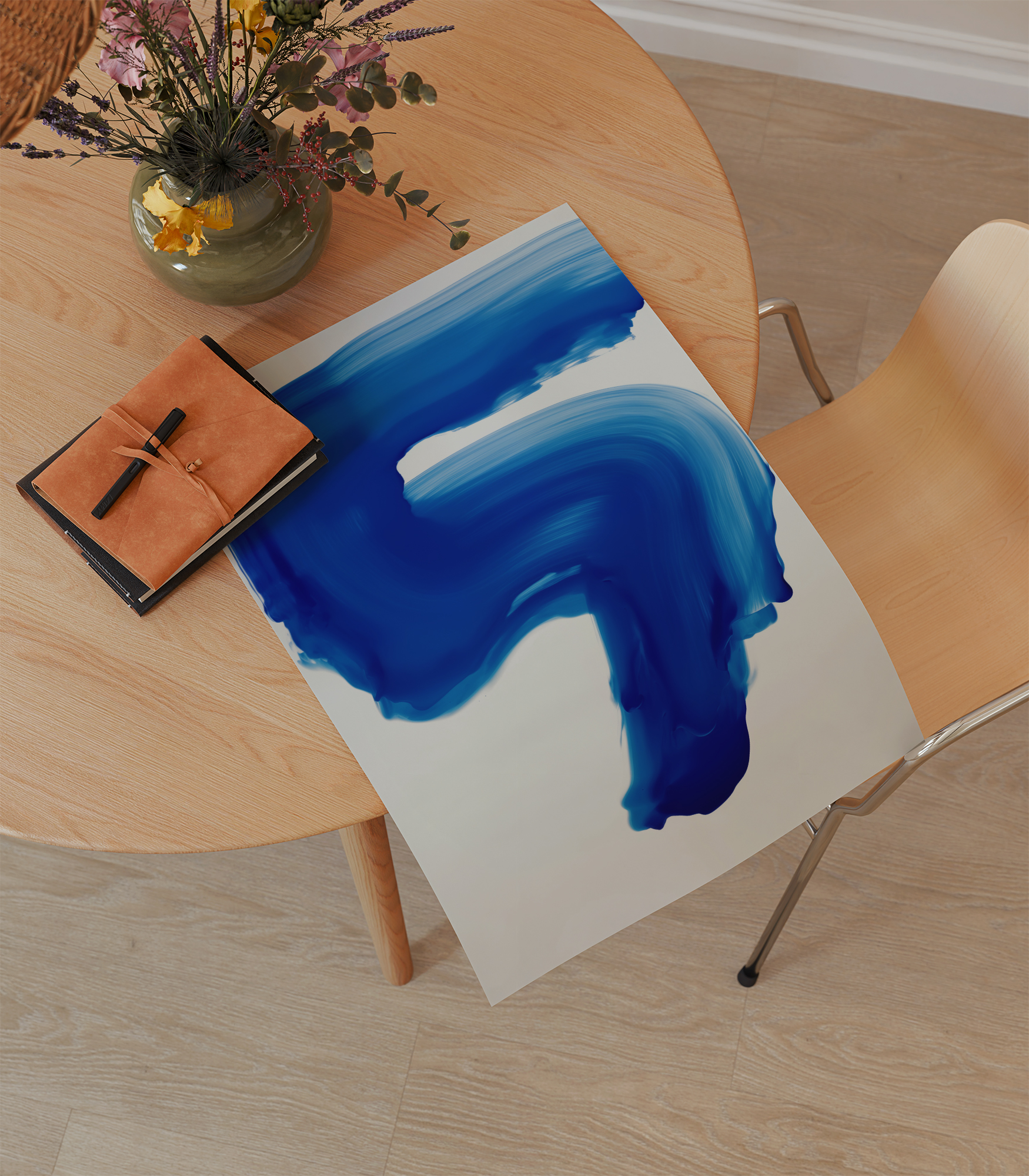 Minimalist wall art featuring a blue brush stroke on a white background. The design captures the natural movement and fluidity of watercolor on paper, creating a simple yet expressive composition. Perfect for modern, minimalist, and Scandinavian interiors.