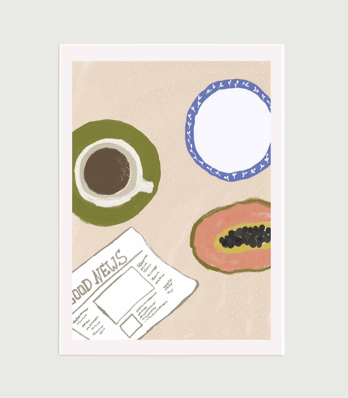 Modern still life wall art featuring a coffee cup and a “good news” newspaper on the table, illustrated in a soft gouache painting style. The pastel color palette and flat lay composition create a calm, modern lifestyle aesthetic. Perfect for kitchens, coffee corners, studios, or gallery walls.